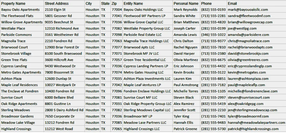 Your list will include 50 verified apartment owner contacts with the exact fields listed on this page.
